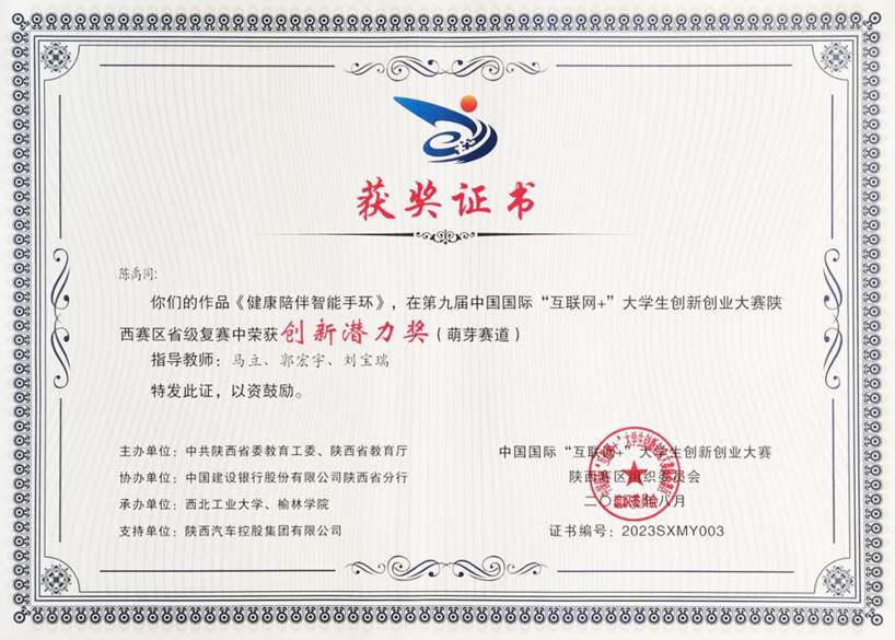 在参加总结赛之前,该项目经过省市两级评审,在马立、郭宏宇、刘宝瑞三位老师的指导下,《健康陪伴智能手环》荣获省级“创新潜力奖”与市级“创新潜力奖”。
