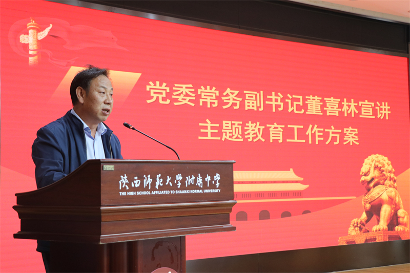 会上,党委常务副书记董喜林宣读了《中共陕西师范大学附属中学委员会印发<关于深入开展学习贯彻习近平新时代中国特色社会主义思想主题教育的实施方案>的通知》,对党中央开展主题教育的历史背景和现实意义进行了解读,对相关工作提出了要求。