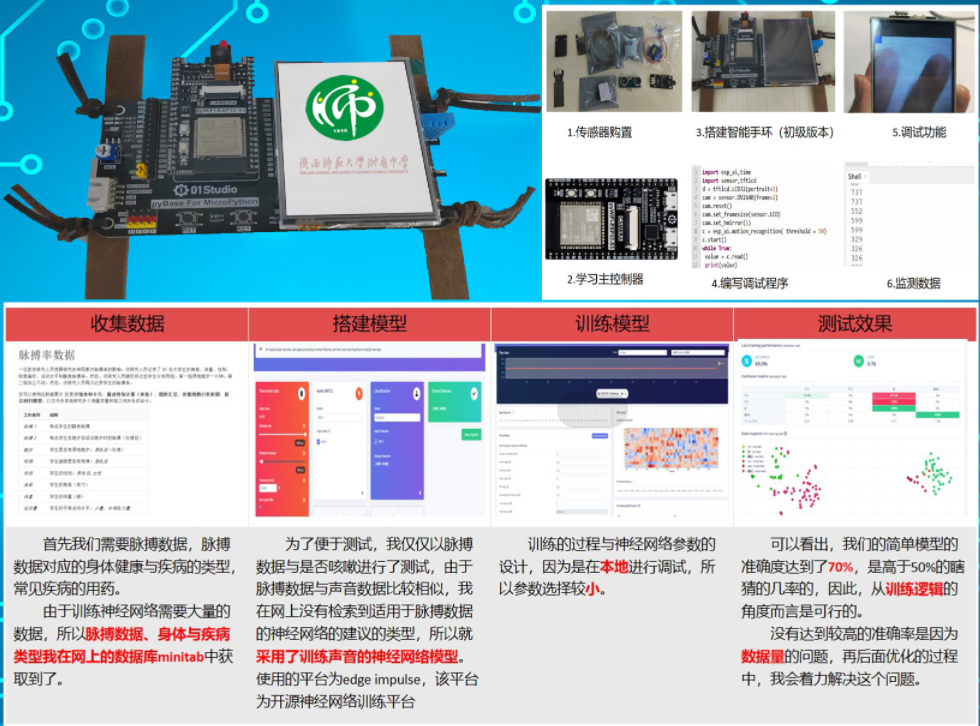 作为一名高中生,通过高一对《信息社会与系统——必修二》的学习,我希望创建一个能帮助中学生预防疾病、高效学习、科学运动、健康休息的开源电子产品设备。无疑,智能手环是一个非常好的载体,基于此,我设计了基于神经网络技术与中医把脉的中学生健康陪伴智能手环。