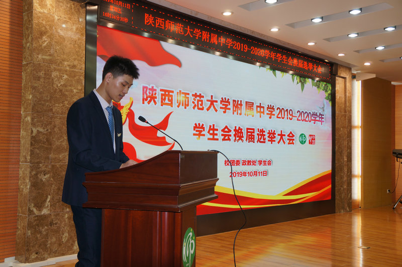 大会伊始,上一届学生会副主席张文婧同学宣读了《陕西师范大学附属中学学生会选举办法》;主席王逸文同学代表上届学生会从开展的常规工作、重点工作以及创新性的工作三个板块作了精彩的卸职演讲,他展示了一年来工作中的亮点也反思了其中存在的不足,希望新一届的学生会能够勤于思考、善于总结,秉持着“全心全意为同学服务”的宗旨,齐心协力把学生会工作做得更加出色。随后,我校教师代表师家庆、巨凯老师为2018-2019学年学生会主席团及部长颁发了荣誉证书。
