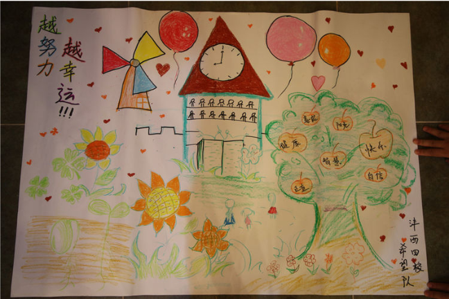 要点2:“越努力越幸运”这架在彩虹上的字是七彩的,作为教师需要保持拼劲,要未雨绸缪的努力,才会有机会开出幸运的花朵。