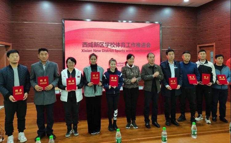 会议第四项,宣读西咸新区中小学体育教学指导委员会委员名单。我校体育教师张晨卿被聘为西咸新区体育教学指导委员会武术委员,体育教师王静被聘为西咸新区体育教育指导委员会啦啦操委员。