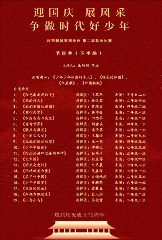 此次歌咏比赛分为上下半场。一至七年级每个班级演唱两首曲目。必唱曲目:《祖国祖国我们爱你》、《红星歌》、《少年少年祖国的春天》、《绿色的祖国》、《红旗飘飘》、《同一首歌》与自选曲目。