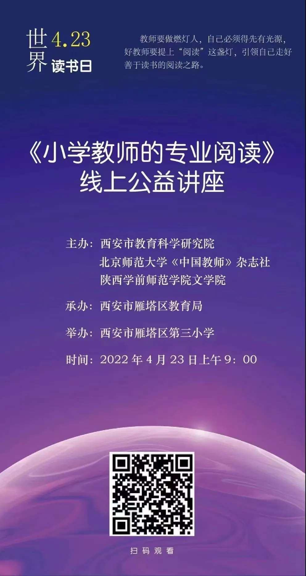 为建设高素质、专业化、创新型教师队伍,推进落实《“三标、三课、 一赋能”行动实施方案》,4月23日上午,我校小学教师积极参与了由西安市教育科学研究院、北京师范大学《中国教师》杂志社、陕西学前师范学院文学院主办,西安市雁塔区教育局承办的《小学教师的专业阅读》线上讲座。
