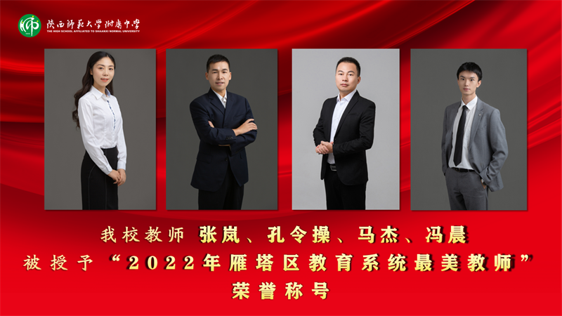 根据文件《中共西安市雁塔区委文明办 西安市雁塔区教育局 关于公布“2022年雁塔区教育系统最美 教师系列”评选结果的通知》(雁教发〔2022〕86号),我校4位教师被授予“2022年雁塔区教育系统最美教师”称号,其中,我校教师张岚被授予“雁塔区教育系统最美教师——师德标兵”荣誉称号,教师孔令操被授予“雁塔区教育系统最美教师——教学标兵”荣誉称号,教师马杰被授予“雁塔区教育系统最美教师——优秀班主任”荣誉称号,教师冯晨被授予“雁塔区教育系统最美教师——青年岗位标兵”荣誉称号。