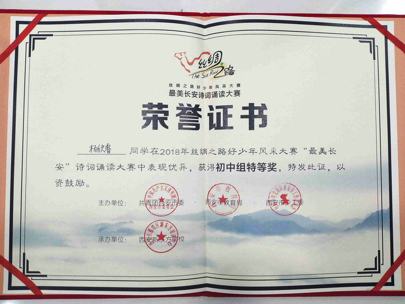 2019年元月13日,由共青团西安市委、西安市教育局、西安市少工委联合主办的 2017丝绸之路国际青少年风采大赛暨最美长安诗词诵读大赛决赛、颁奖典礼在西安市翱翔国际会议中心举行,我校朗诵与播音主持社团成员初2020届12班杨欣睿、初2020届3班王瑞琦、闫瑭裿、初2021届薛林翮同学在全市两万多名报名参赛选手中脱颖而出,晋级决赛。