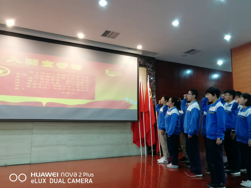 团委书记权小红老师首先简单总结了此次入团同学培训过程(入团积极分子递交申请书,班级、年级推荐确定培训人员,寒晖团课系列培训,团知识考核等),随后权老师宣读了新团员名单,新团员佩戴团徽后,陈午午老师带领新团员进行了入团宣誓,全体团员响亮的誓言在会场久久回荡。